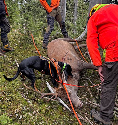 Lancelot toleriert Wolfswitterung und hat eine vernünftige Schärfe. Er ist ein Teamplayer, behält mich im Blick und ist nur mäßig interessiert an gesundem Wild, so ist er sehr "verleitungsresistent" und kommt nach getaner Arbeit zuverlässig zurück. Seine Hetzen am kranken Wild sind auch im Alter noch eine Freude. Im Revier läßt er sich ohne Riemen führen, auf der Pirsch hält er eine absolute und hochkonzentrierte Ruhe. Ins Wasser geht er nur wenn es unbedingt nötig ist.